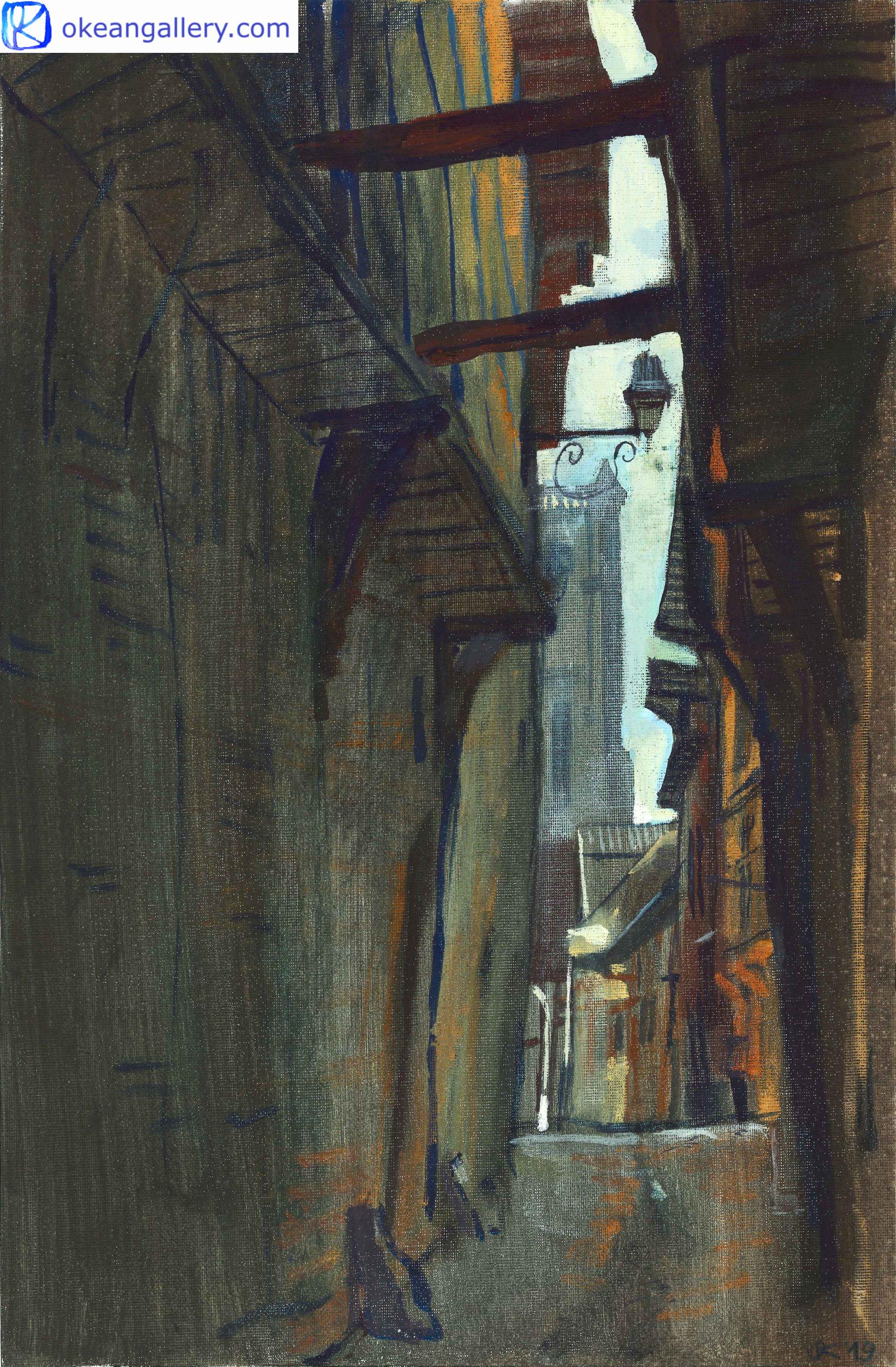 One-of-a-kind medium tempera painting on paper Size : 41 x 33 cm Format : vertical This urban landscape represents a narrow street in the historic “Street in the Old Town of Troyes (#543)”