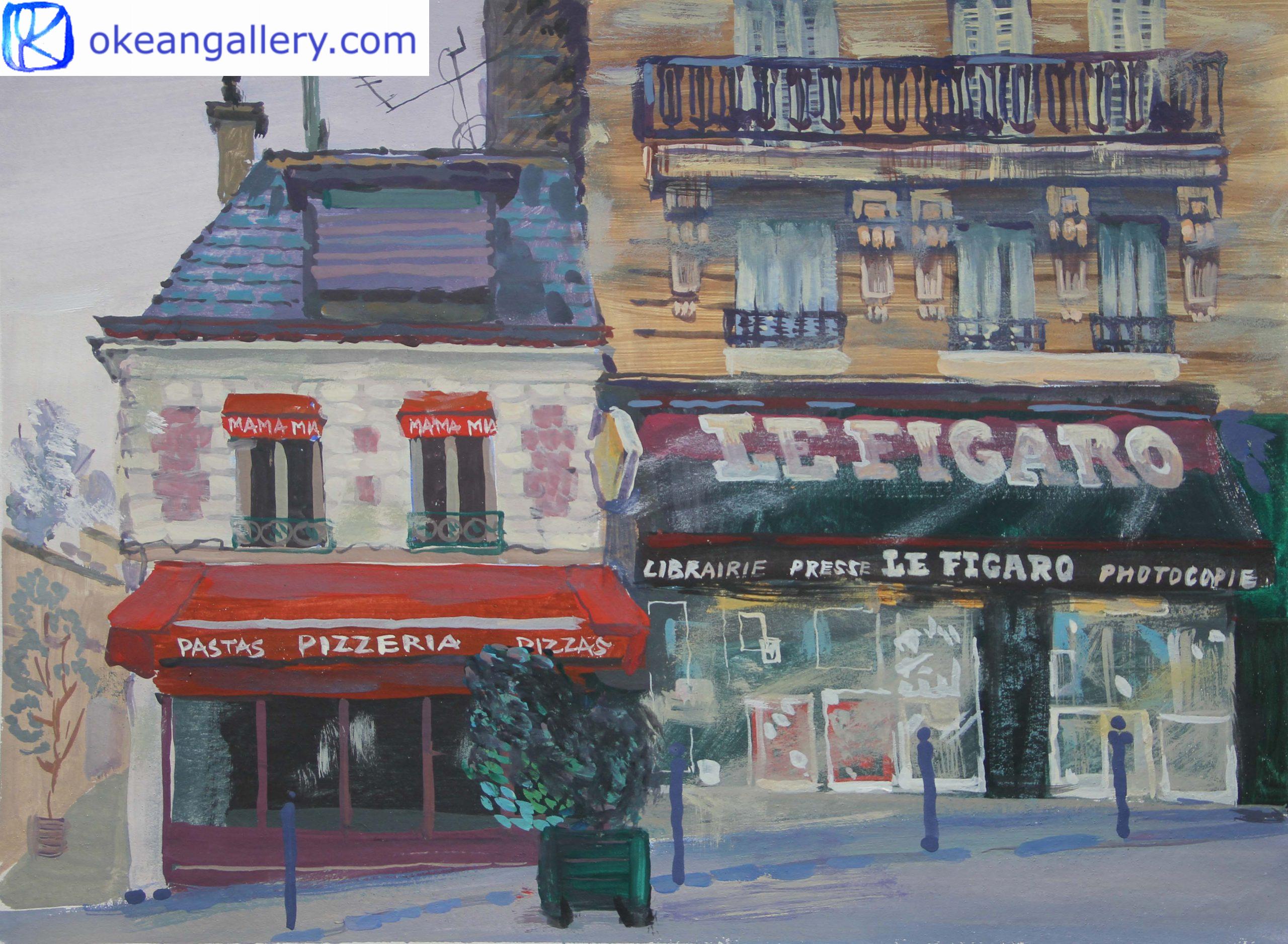 Keywords: urban landscape, sky, architecture, France, French landscape, Paris, travel, red, green, cobalt, cerulean, emerald, brick, clouds, stroll in the streets, summer, wall decor, cityscape, pizzeria, bookshop