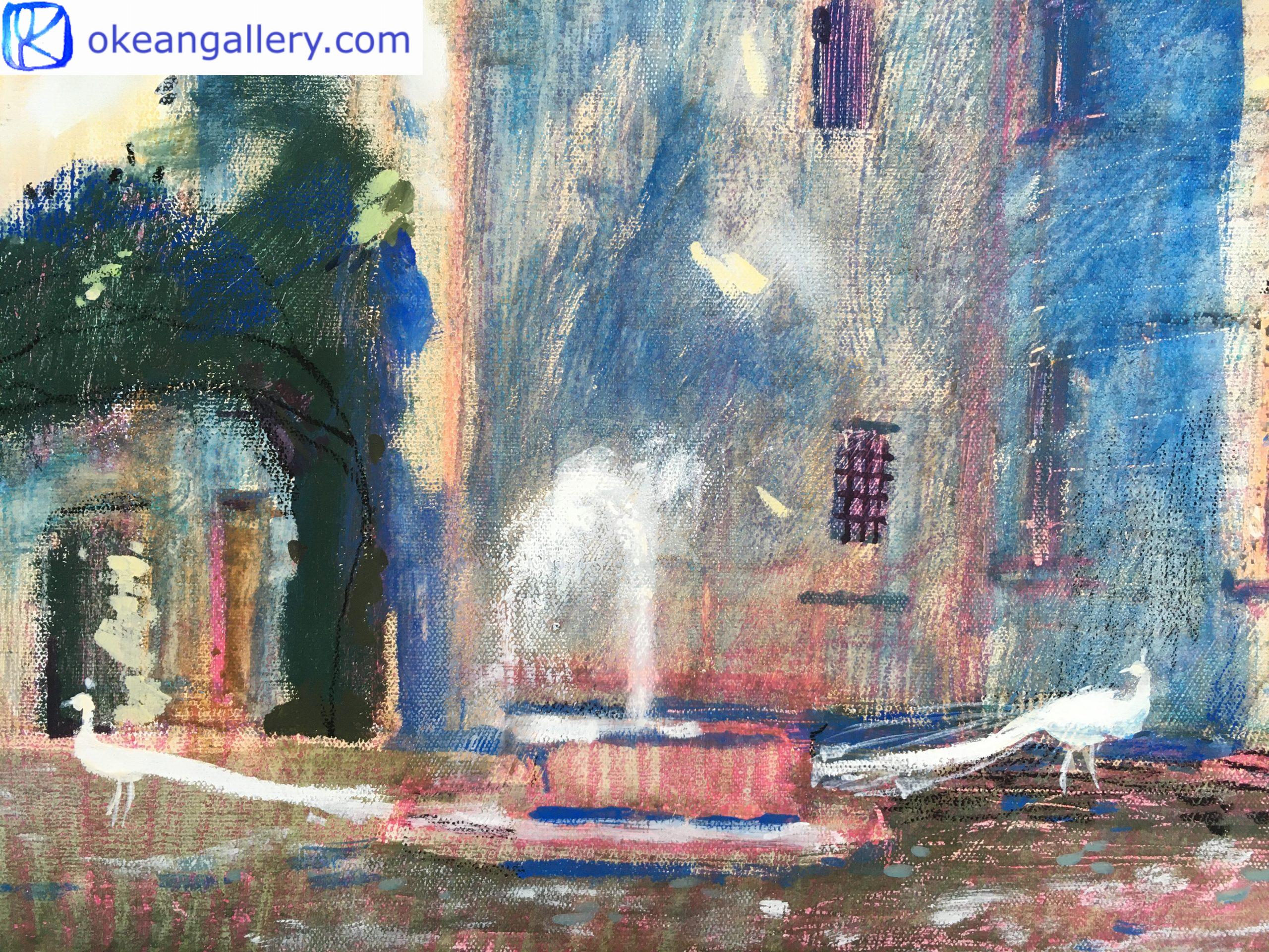 Ce paysage à la tempera sur toile d’un format moyen horizontal est peint dans la cour intérieure du Château de Rivau. Son ambiance est magique, un peu mystérieuse et calme. La vue de ce château médiéval évoque le décor d’un conte de fée français. Deux paons blancs font leur promenade autour d’une fontaine.