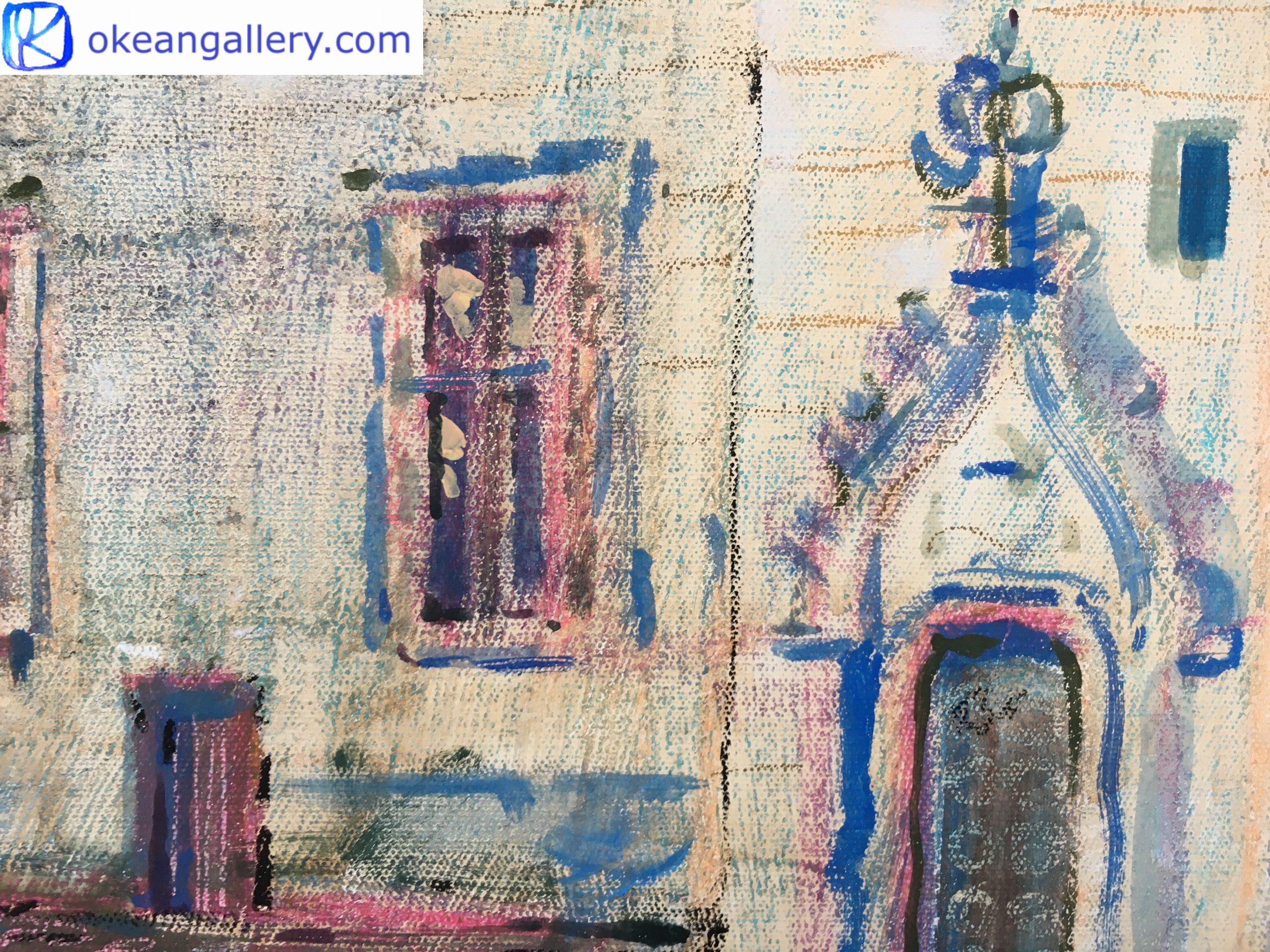 Le coloris est clair et lumineux, relevé par un contraste des ombres du soir qui glissent sur les murs en pierre.