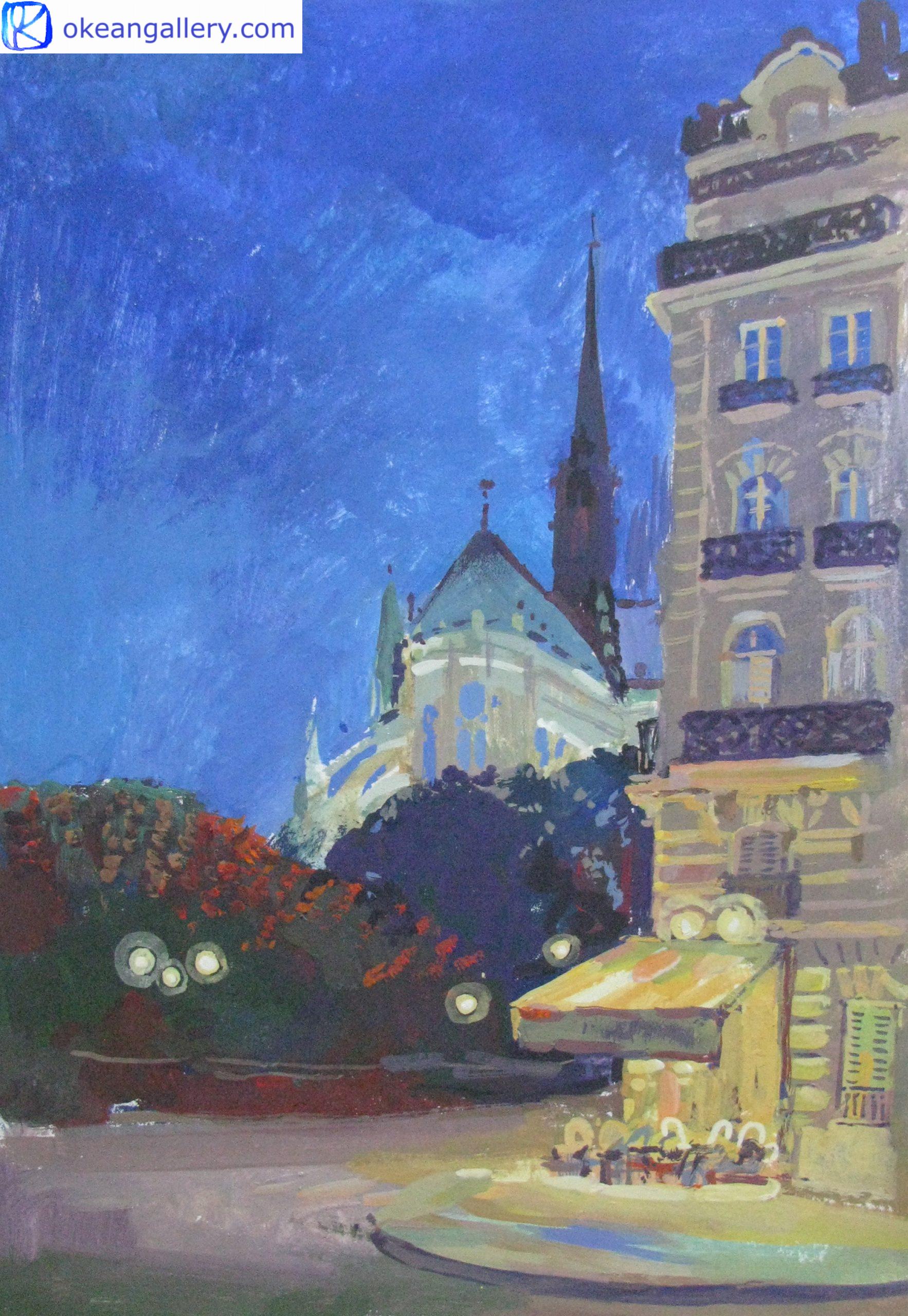 Mots clés : paysage urbain, bâtiment, architecture, France, culture française, Paris, voyage, rouge, vert, cobalt, céruléen, restaurant, nocturne, nuit, soirée, outremer, cobalt, jaune, émeraude, cathédrale, mystère, lumière, couleurs vives, contraste, décor mural, paysage urbain.