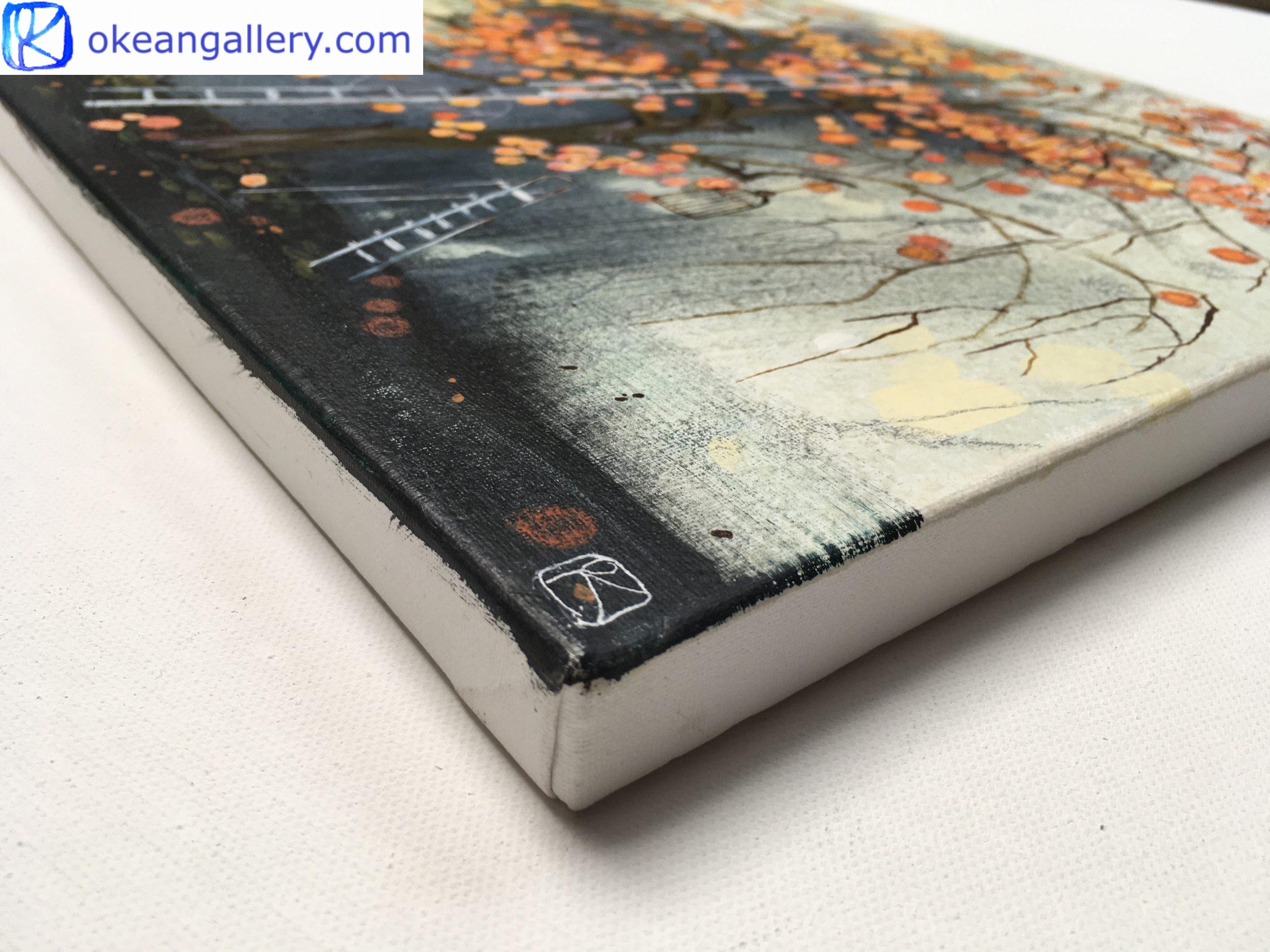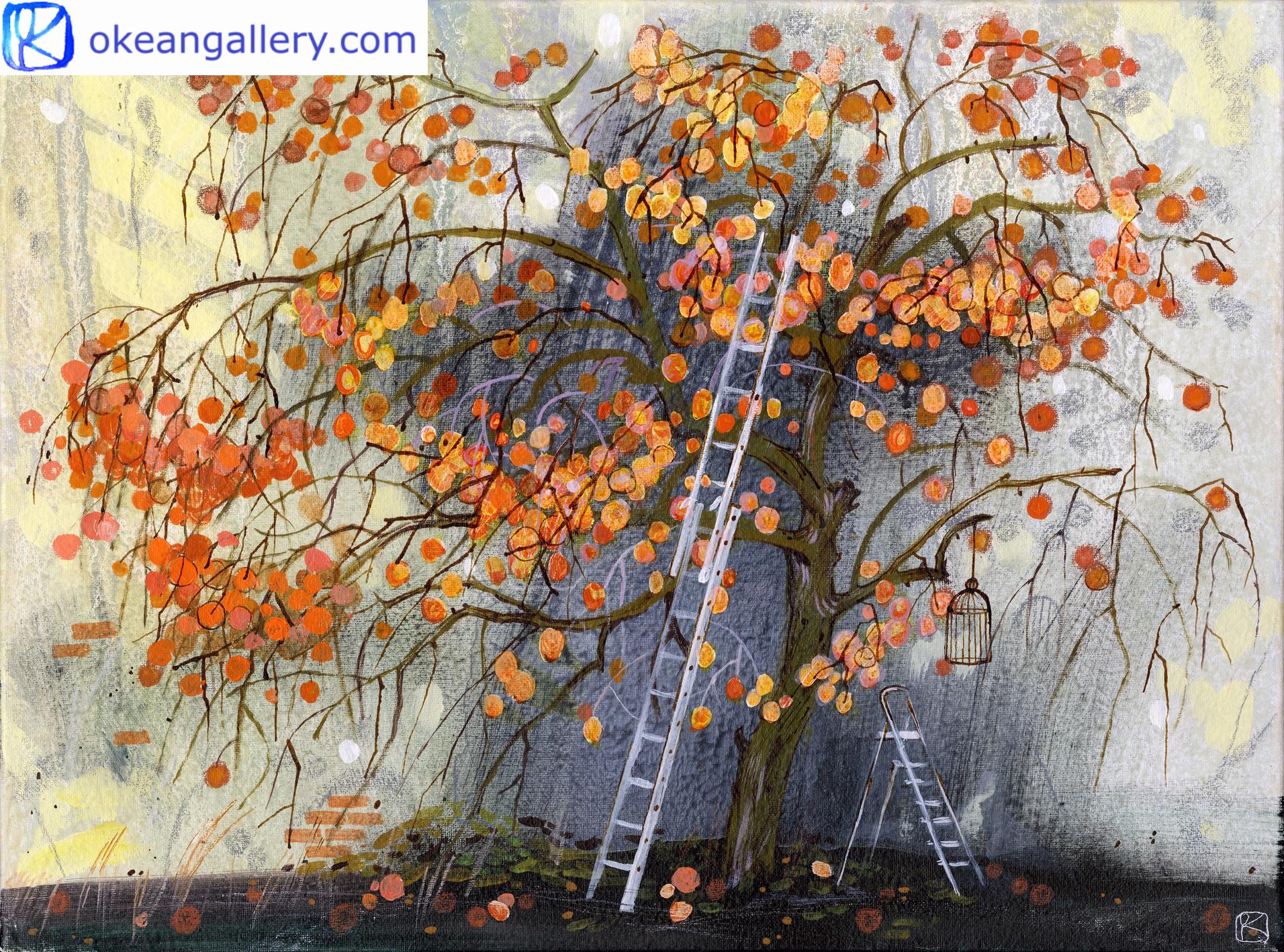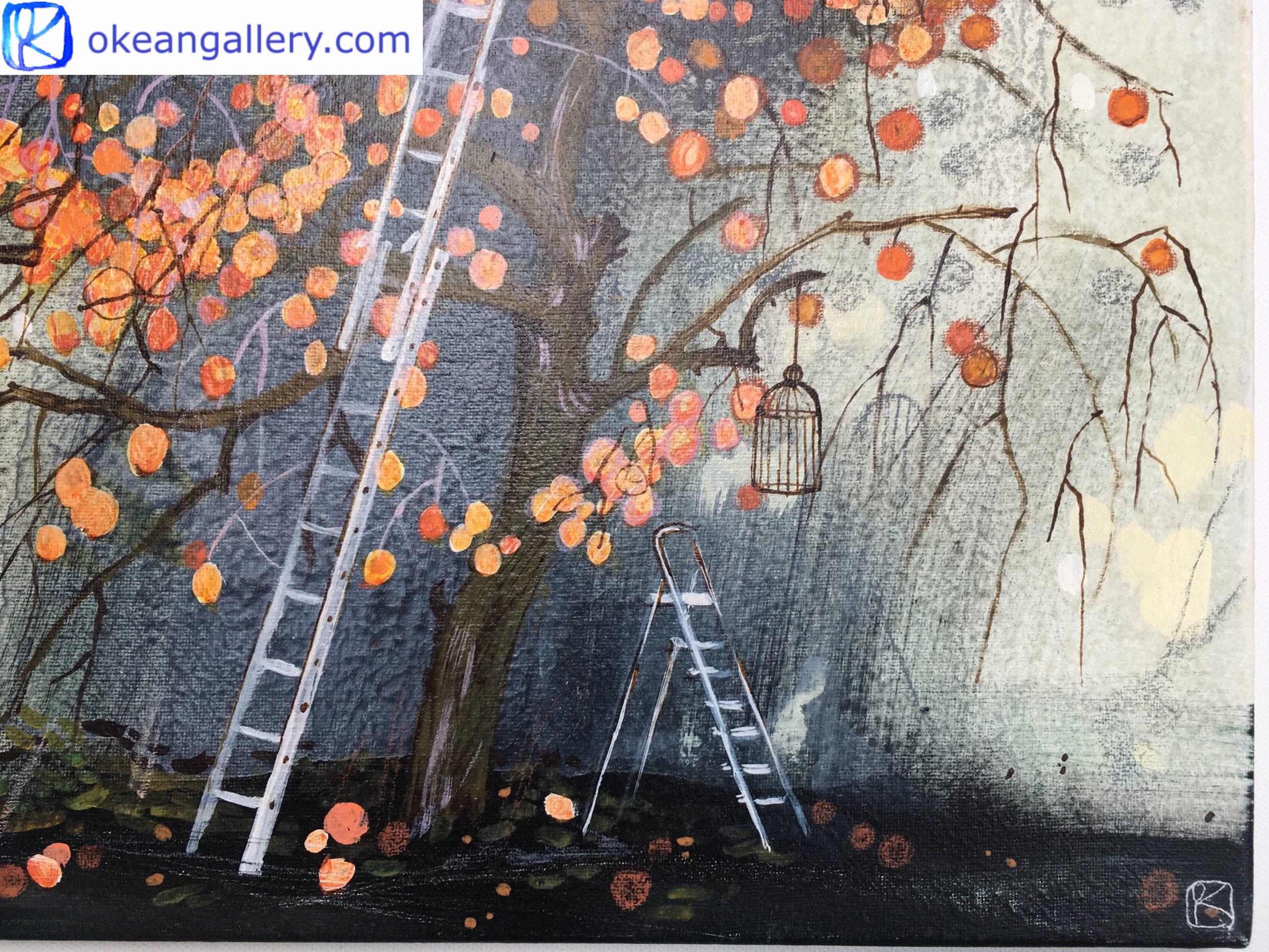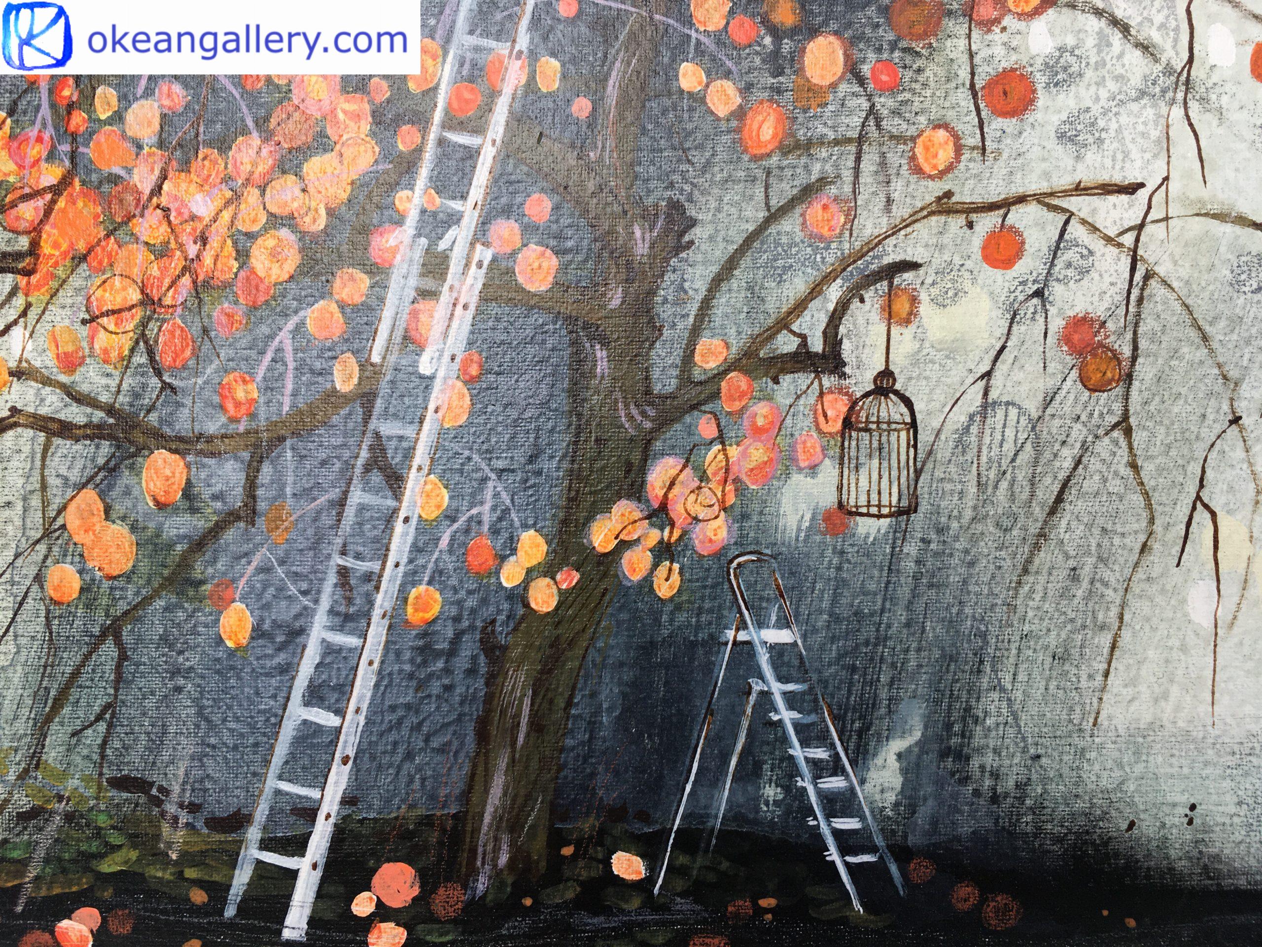 Cette peinture est inspirée par la vue du jardin d’un voisin depuis l’atelier de l’artiste en France. Au milieu de ce verger se trouve un kaki. Ce bel arbre change avec les saisons, mais le plus beau moment est la récolte en automne. L’échelle du jardinier est déjà prête pour la récolte. Les fruits orange évoquent les peintures chinoises et japonaises. Leur fraîcheur et leur goût doux et tendre nous rappellent l’enfance. La couleur intense des kakis est soulignée par le mur sombre derrière eux. Ce contraste joyeux rend la couleur rouge-orange vraiment éclatante.