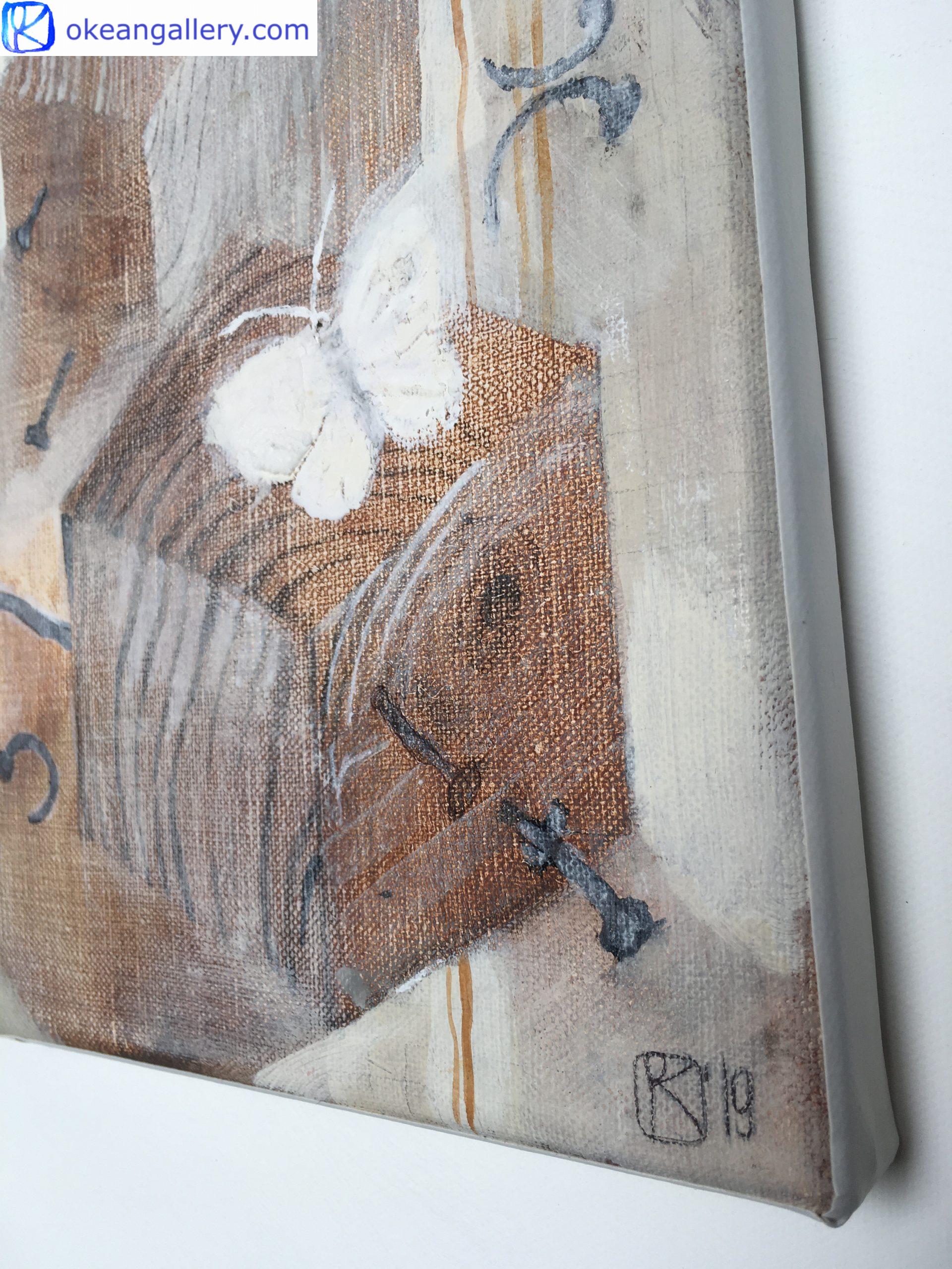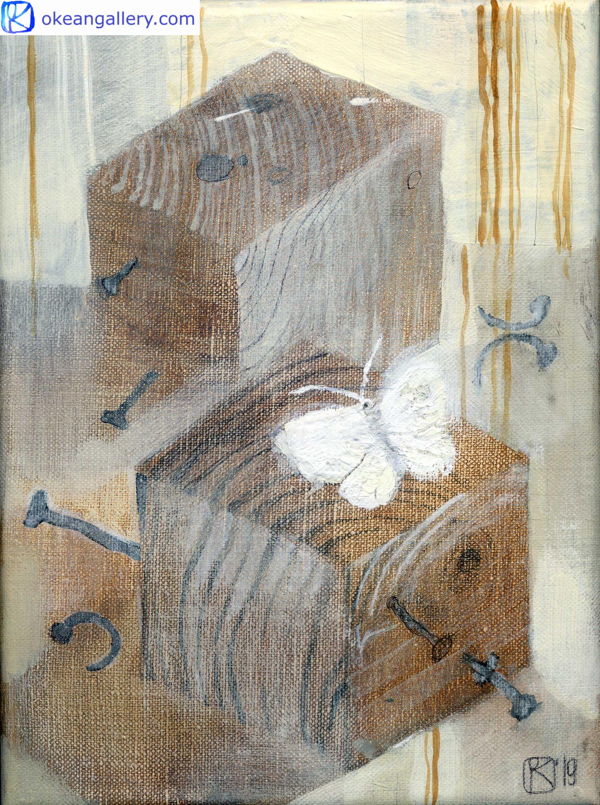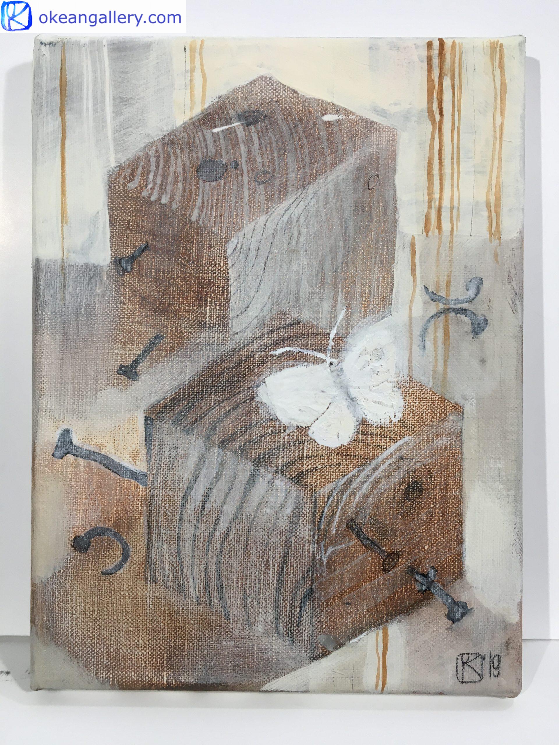 Travailler avec le bois est une pratique calme et méditative. La couleur du bois, ses textures, sa surface chaude gardent des souvenirs de l’époque où ce bois était dans la forêt. Les cycles de la vie, les cycles des saisons, les matériaux qui naissent et qui sont recyclés, existent pour donner vie à de nouveaux mondes. Et la tendre lumière du printemps est partout, avec un papillon blanc comme symbole d’espoir.