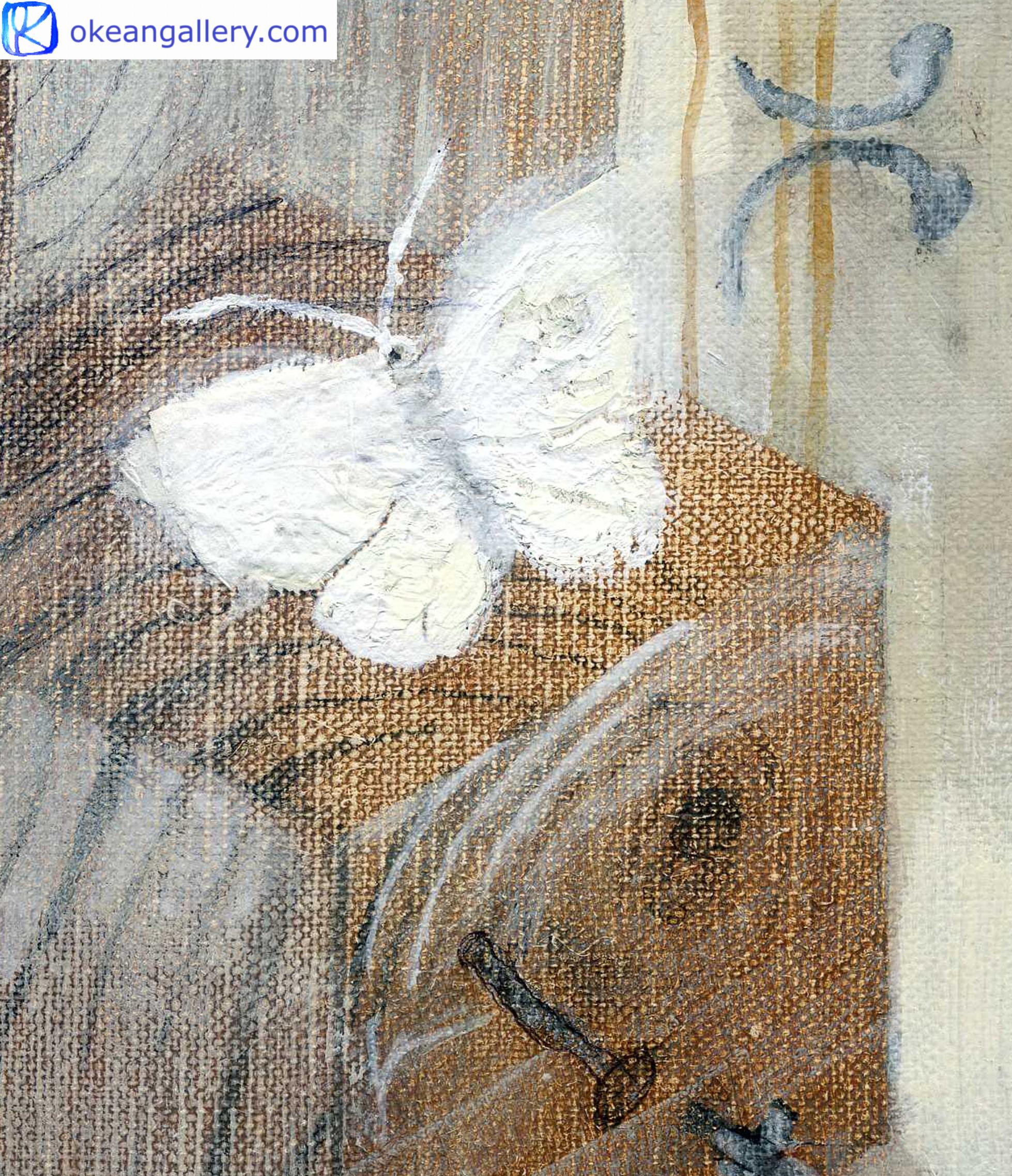 Les couleurs chaudes de cette nature morte sont en harmonie. Presque monochromes, elles font sentir la chaleur du soleil printanier dans l’atelier : blanc, caramel, ocre, sépia, quelques touches de noir pour le contraste.
