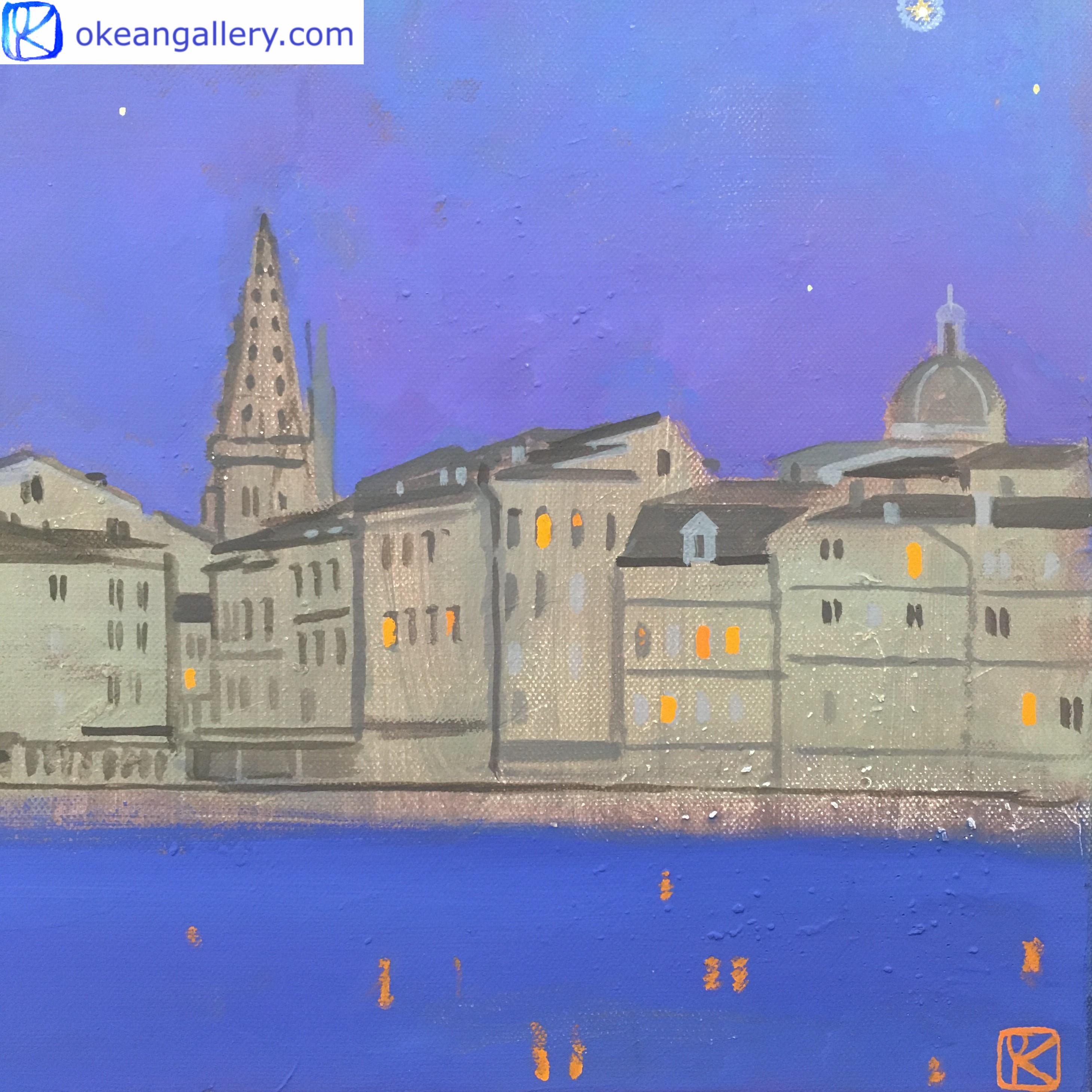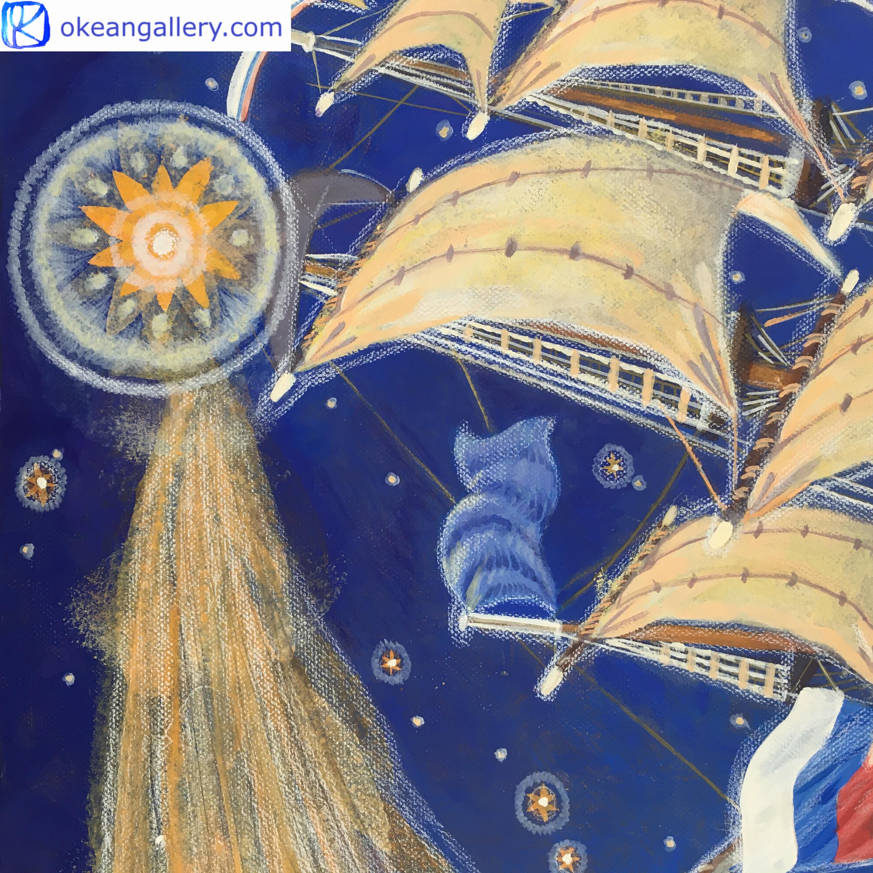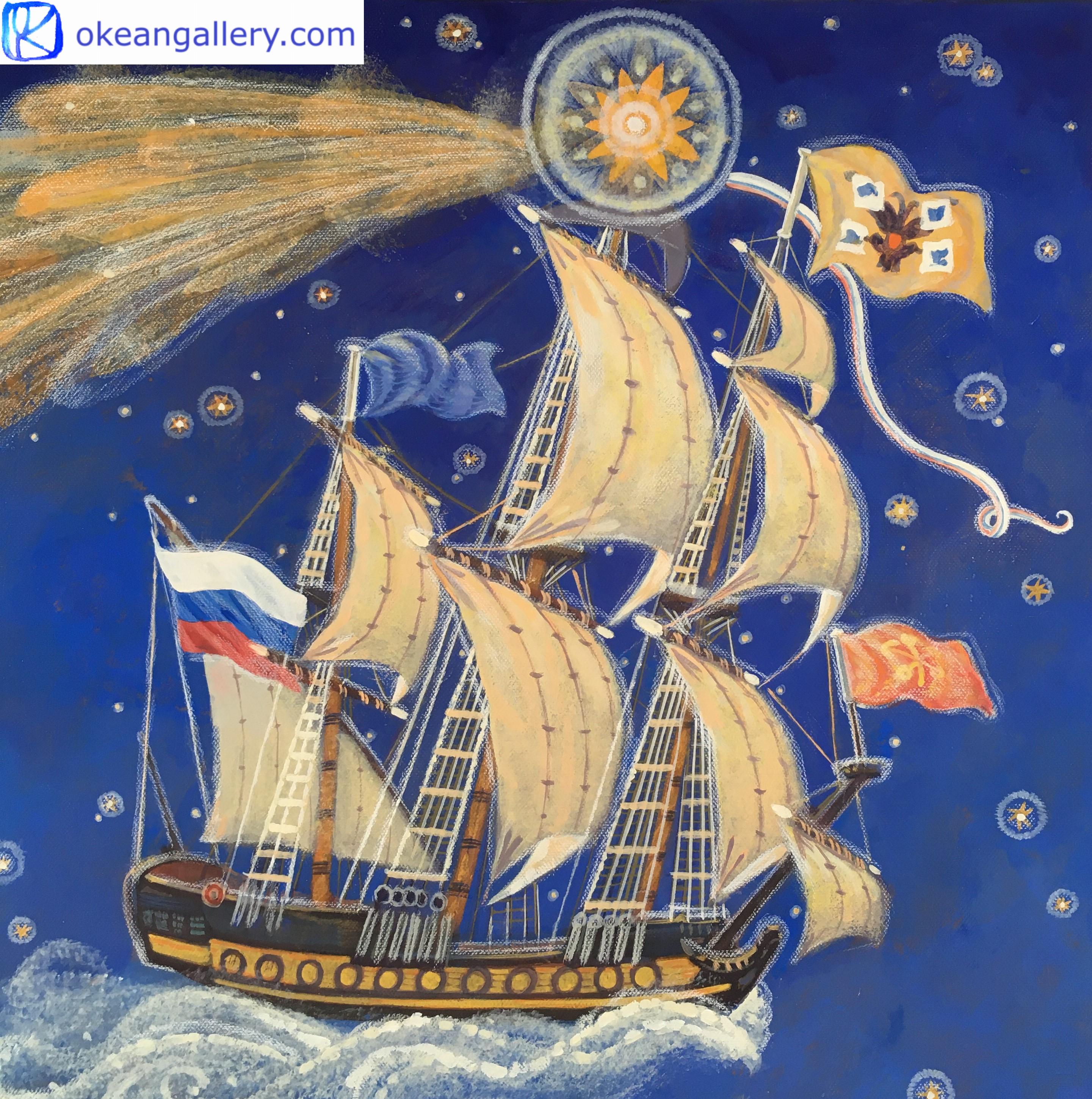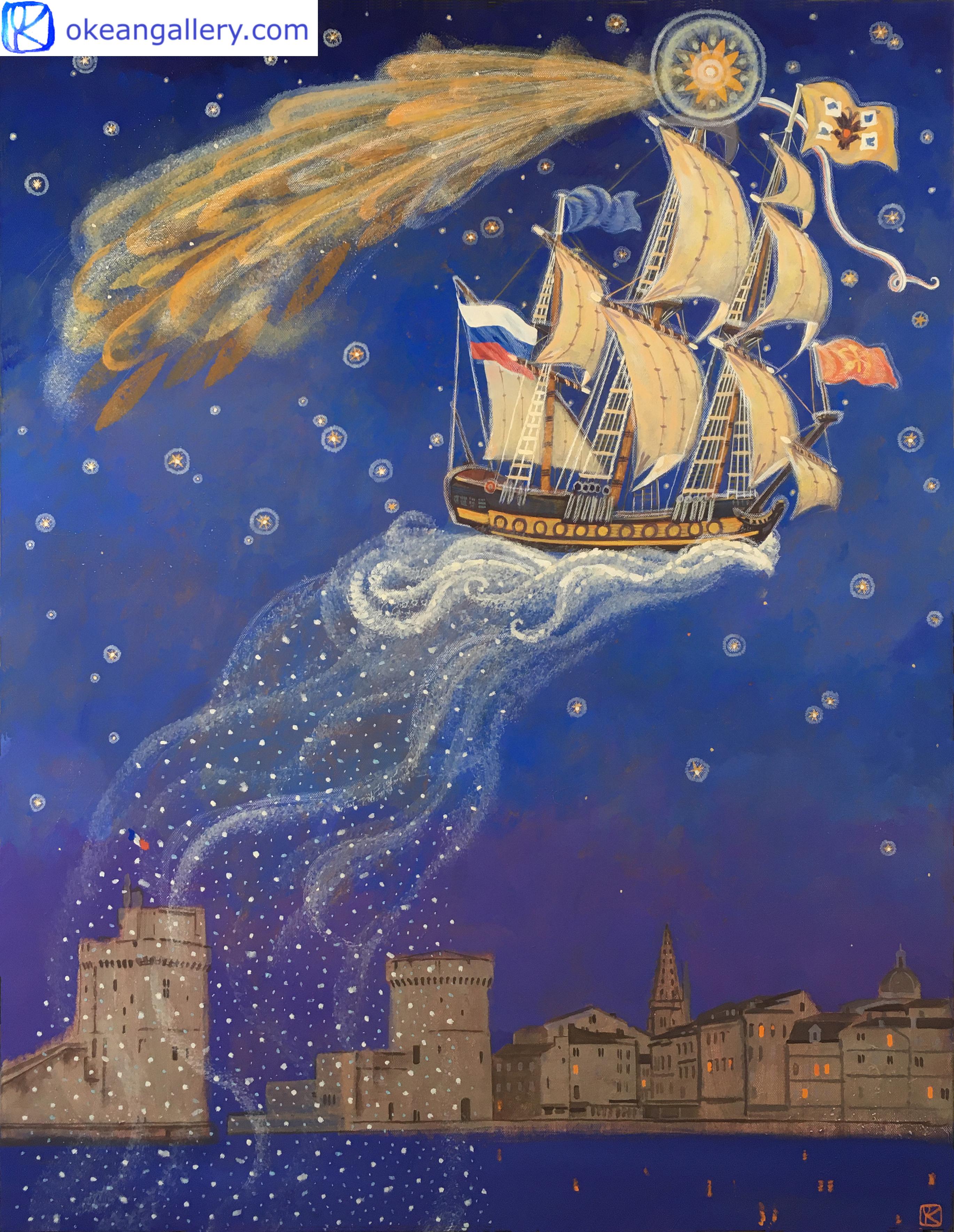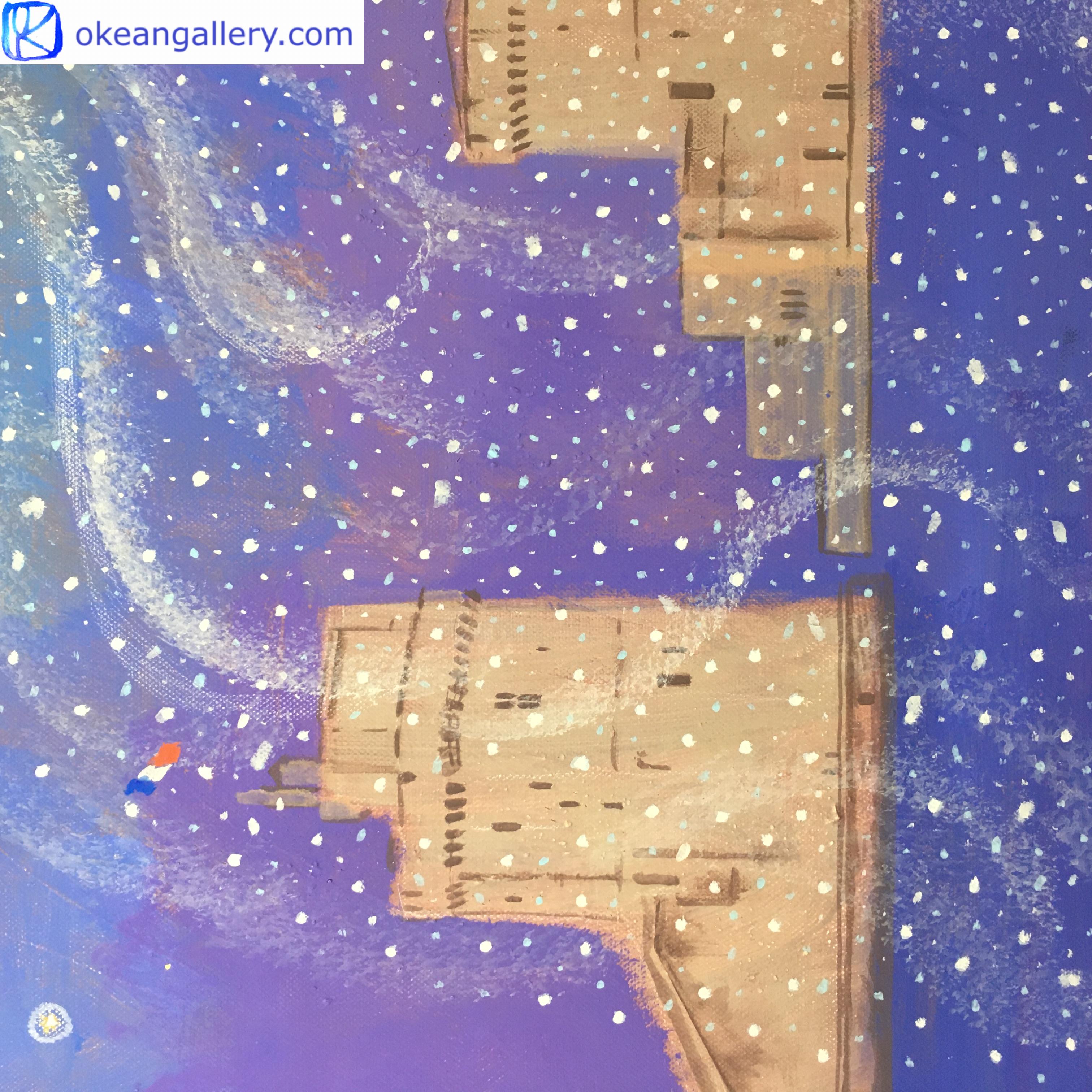 In Europe, snow is increasingly rare. The image of Russian winter makes you dream at Christmas time. In this painting, one of the symbols of Saint Petersburg, the frigate “Shtandart”, offers to European cities the miracle of the first snow, under the light of the Christmas star.