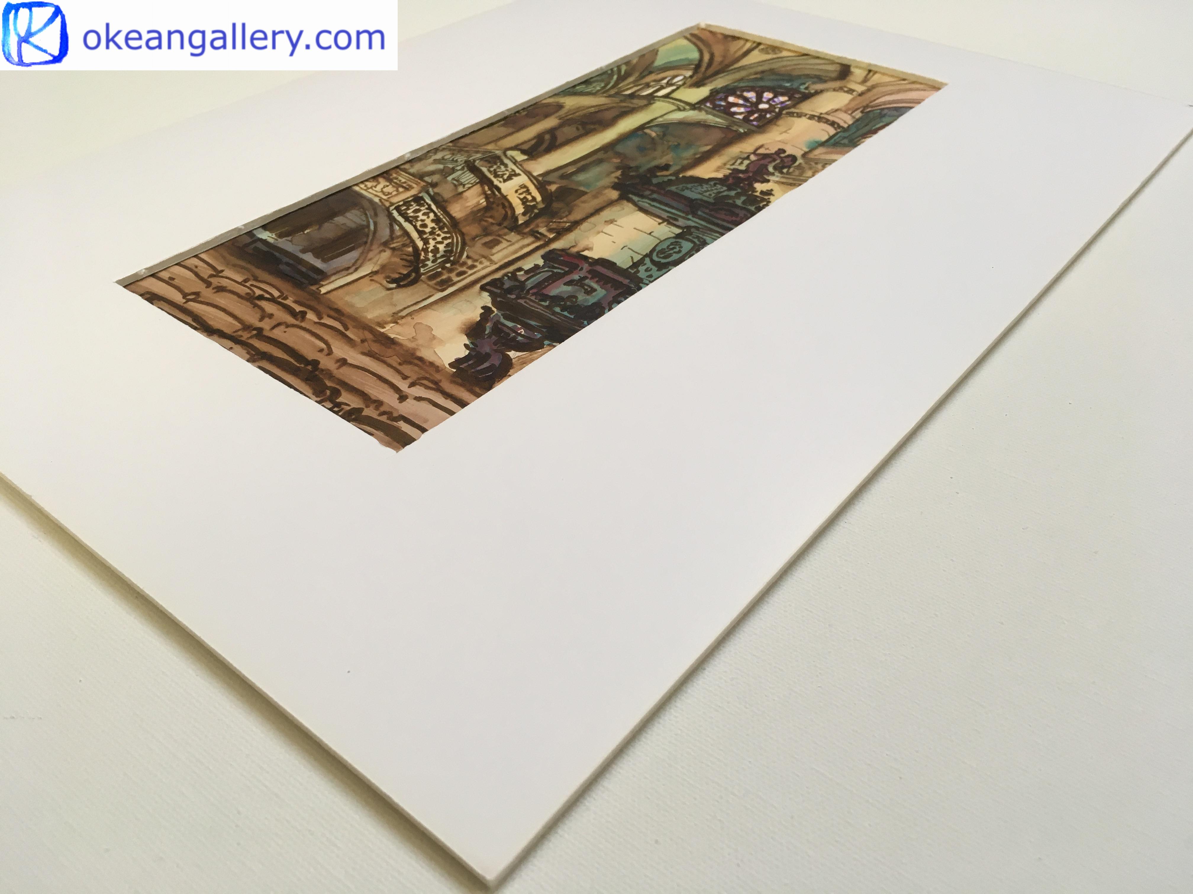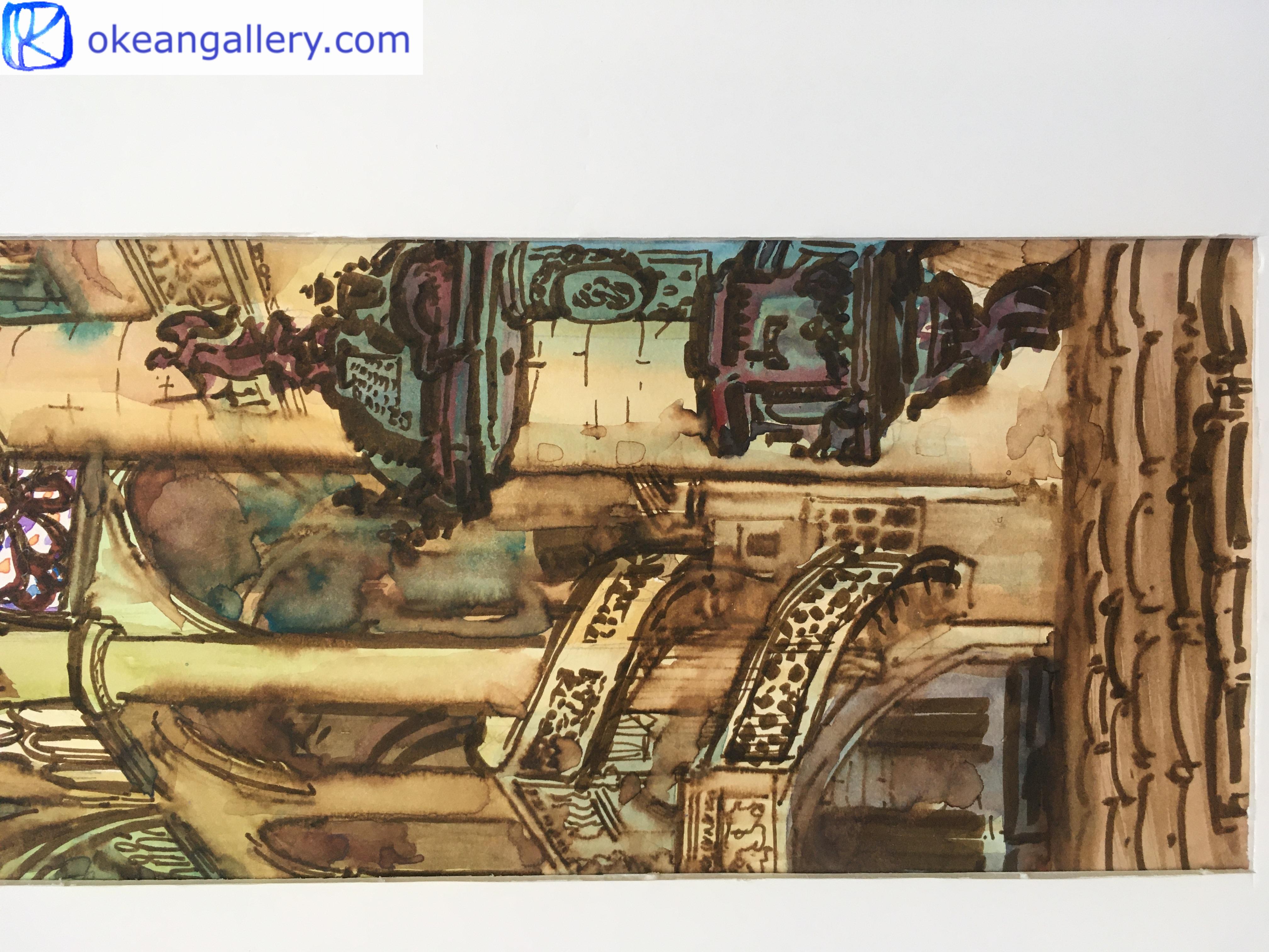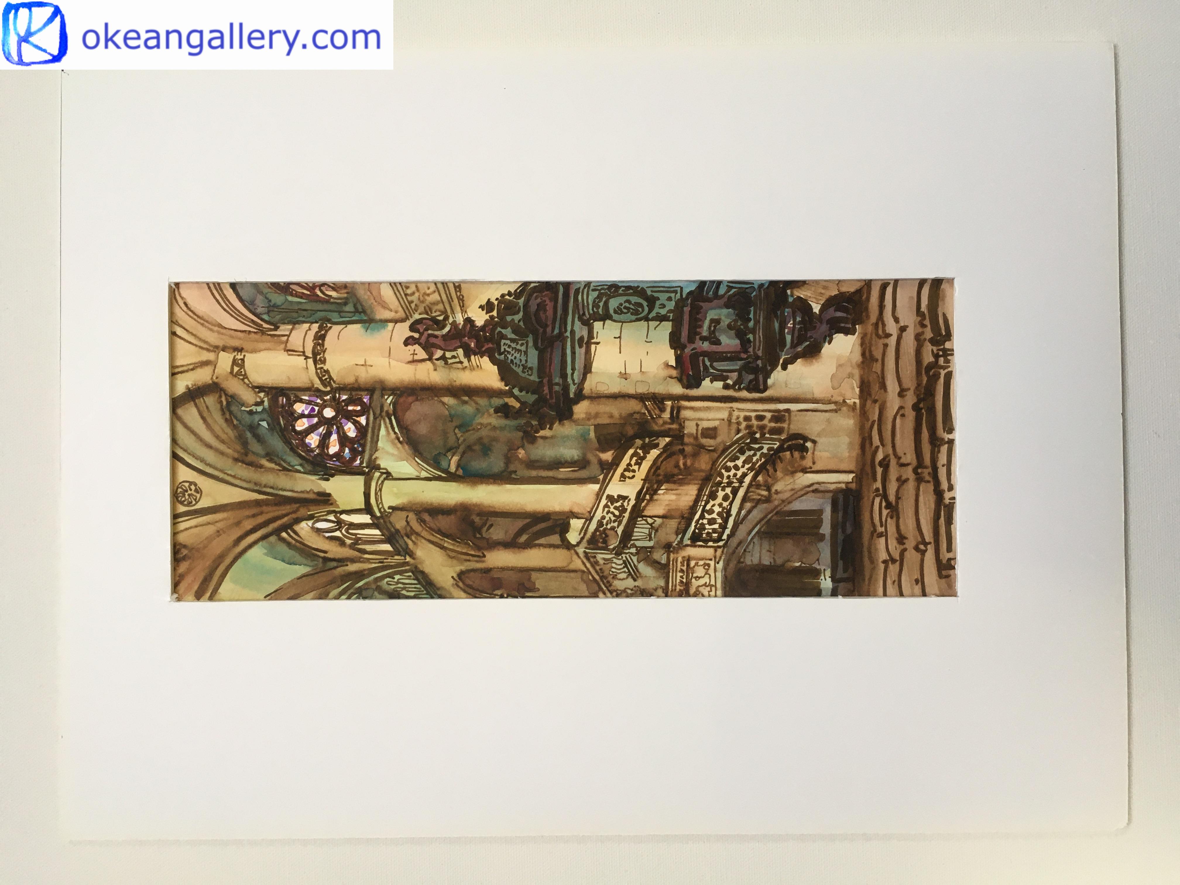 Keywords: urban landscape, architecture, France, French cityscape, medieval, gothic, Paris, wall decor, mystery, street, lane, mysterious, light, contrast, building, interior, church, temple, urban landscape, birthday gift, soft colours, brown, light blue, ochre, gray