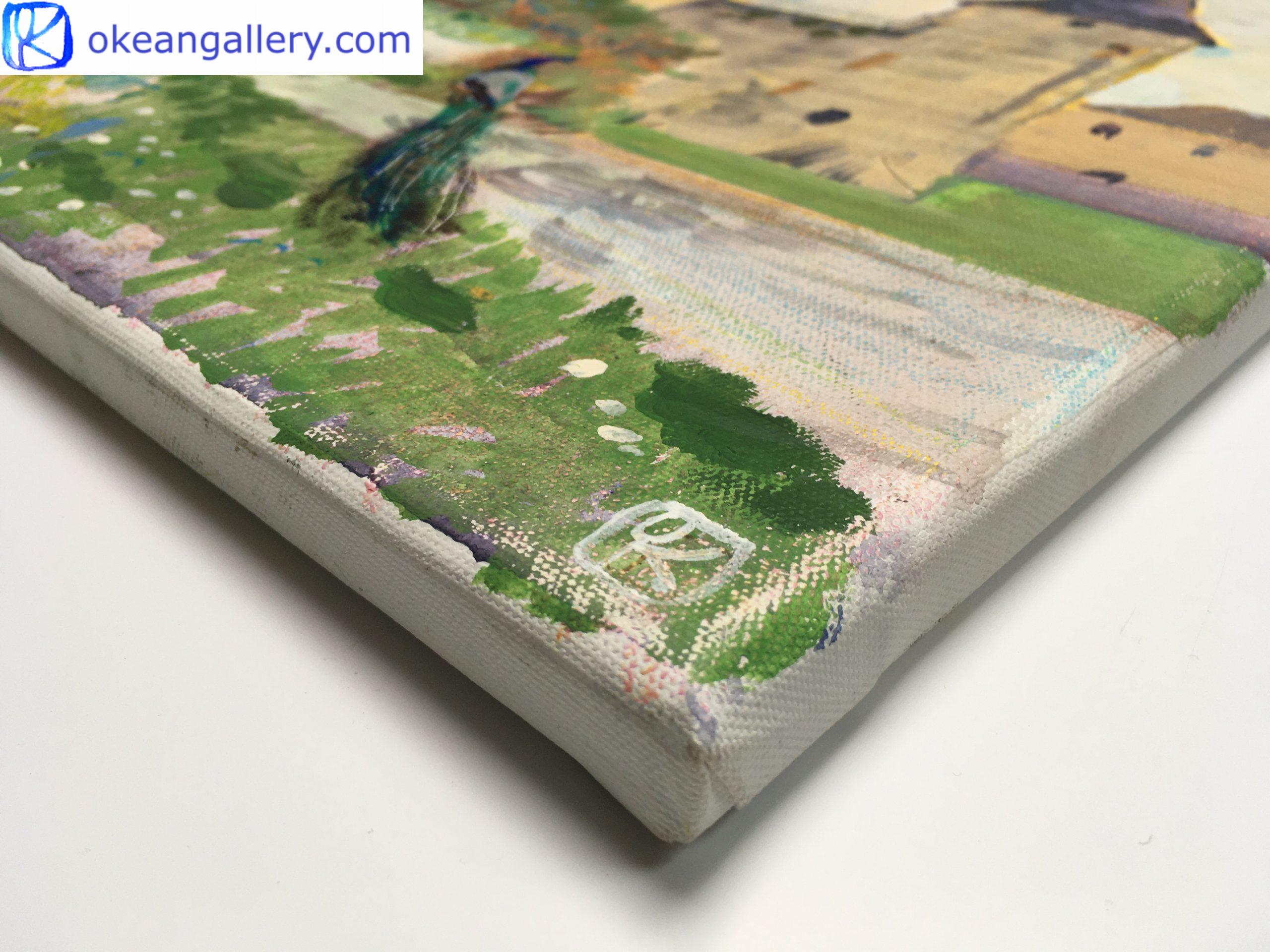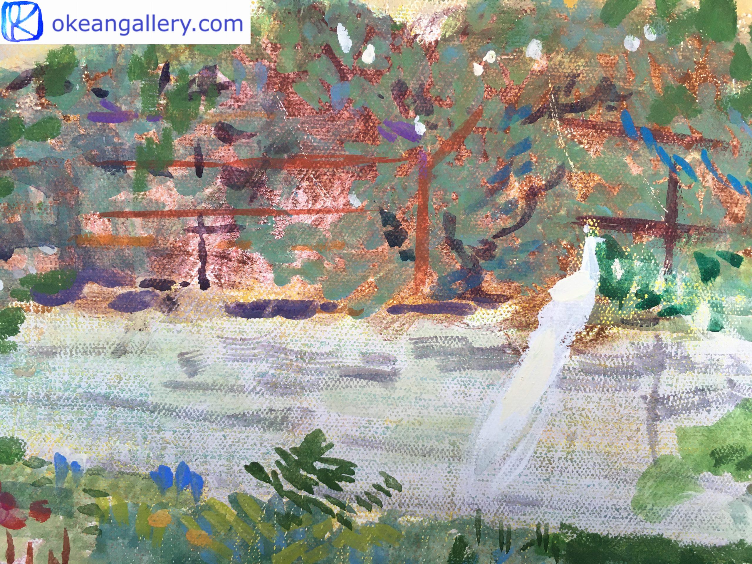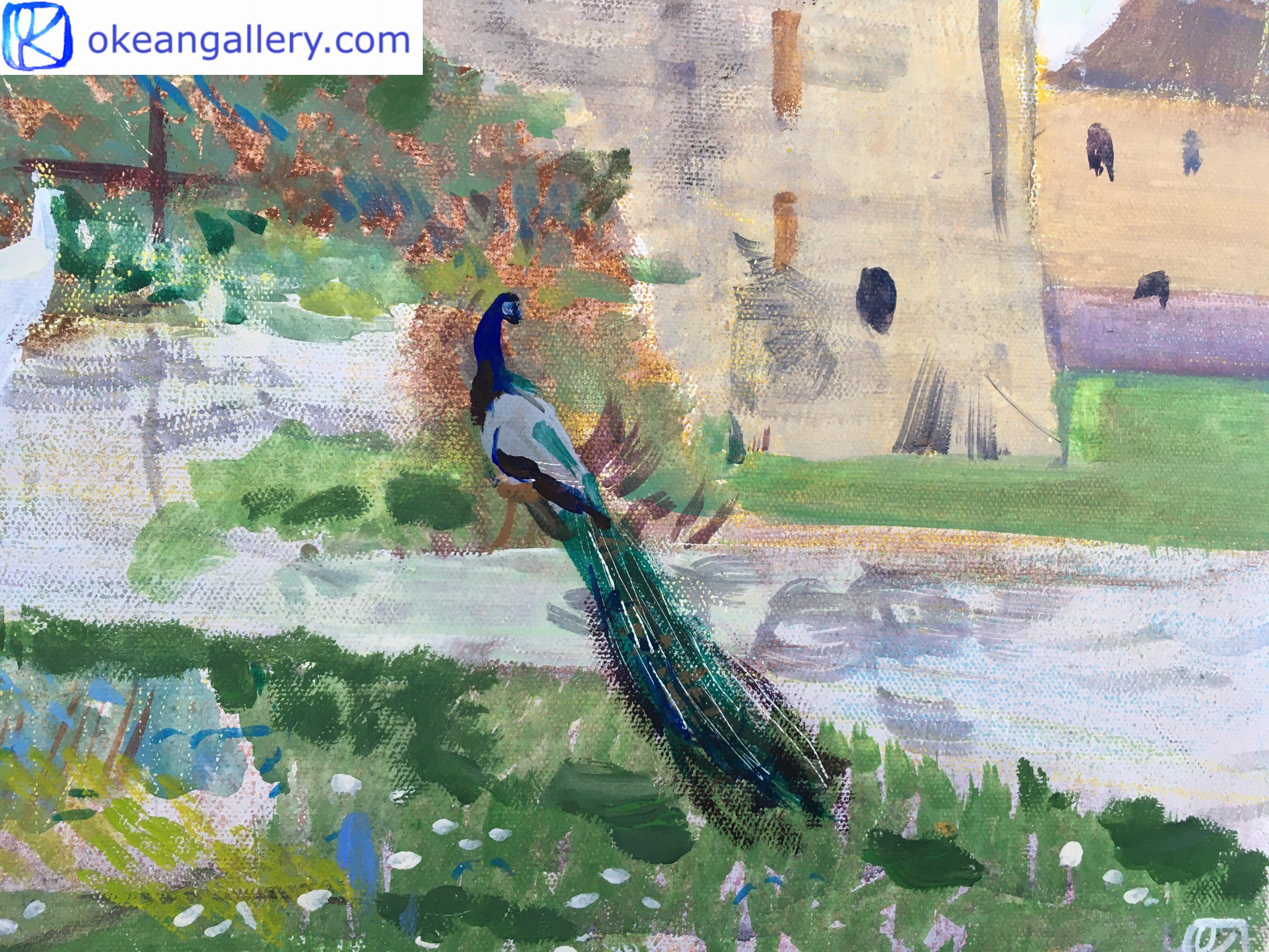 This landscape in tempera on canvas invites the viewer to a walk through the green garden of the Château de Rivau. Its atmosphere is magical, like in a French romantic fairy tale. It looks like a princess’s domain. Two peacocks, blue and white, walk in the fresh green, dotted with softly coloured flowers.