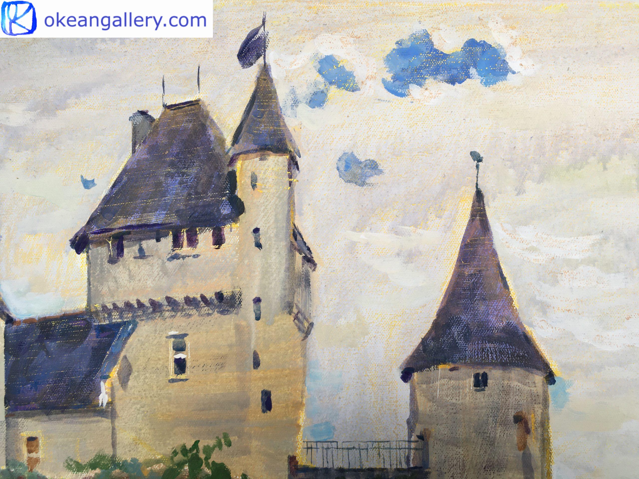 The towers of the castle are clear and blend with the cloudy sky.