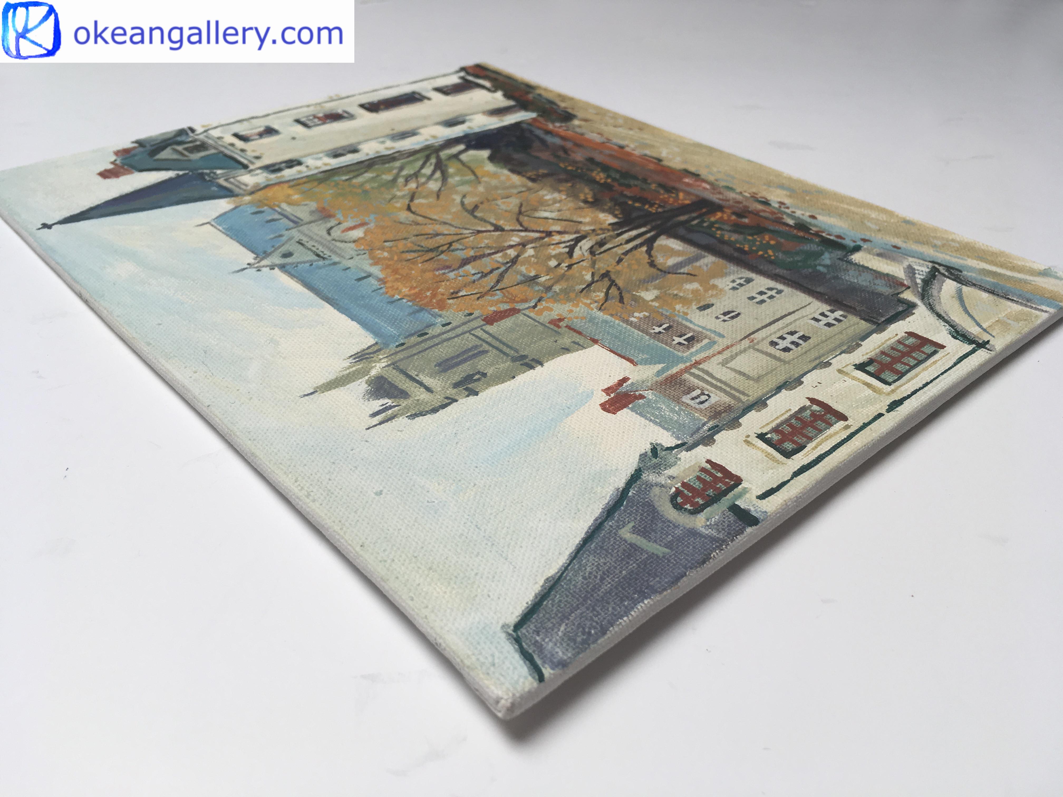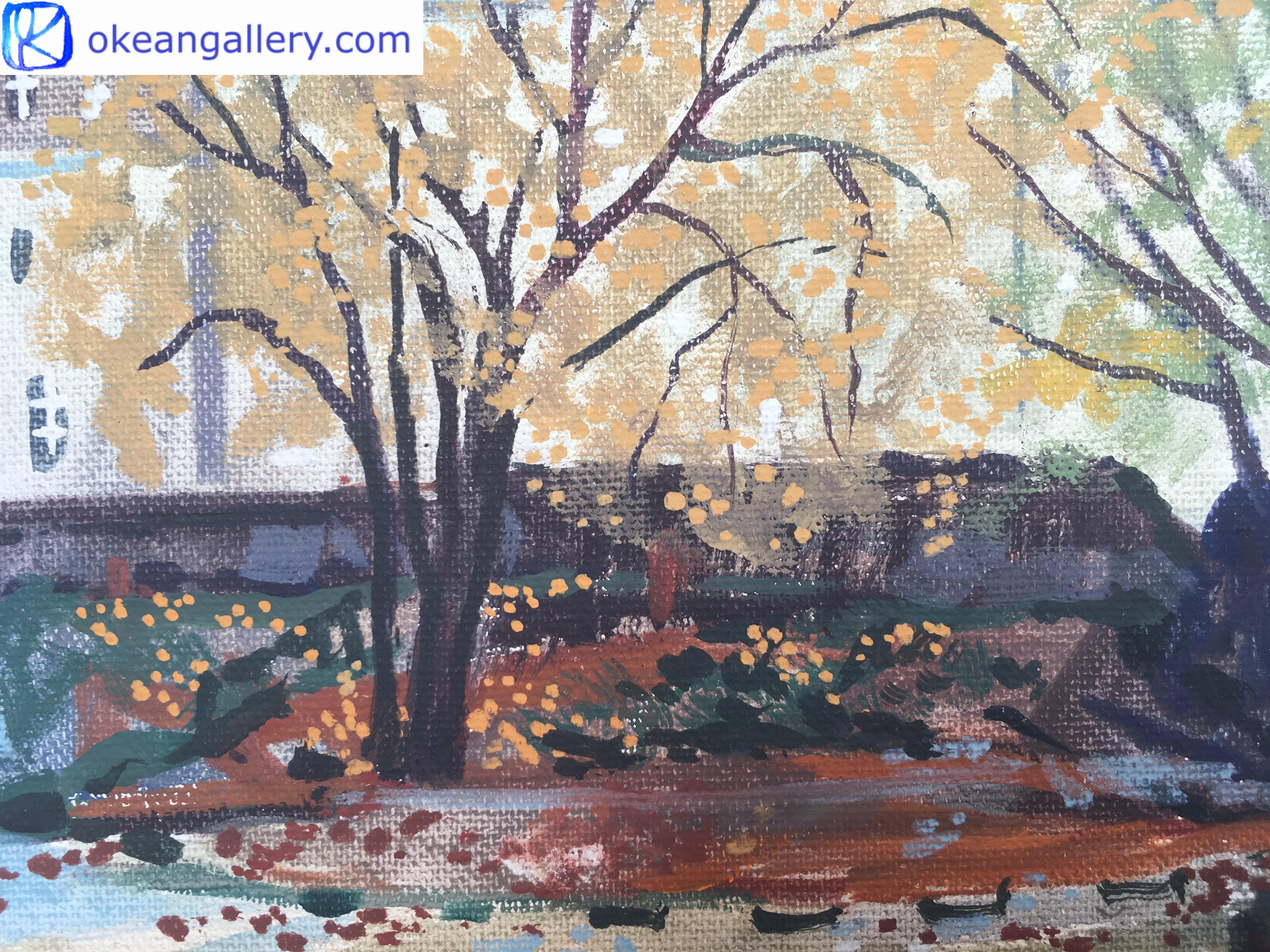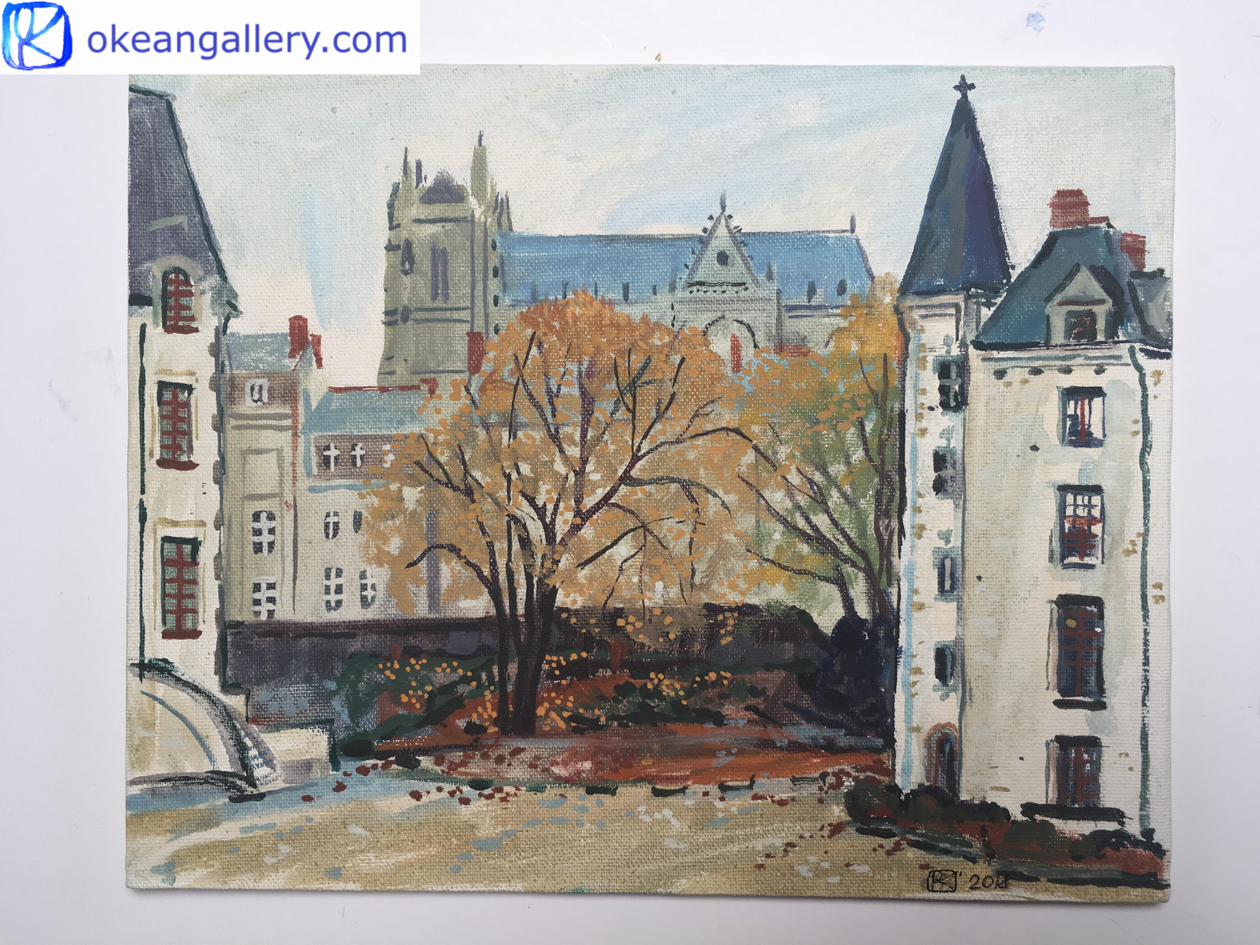 This is a realistic landscape painting from artist’s journey to Nantes (France). The bright yellow colour of the autumn leaves shines like gold against the white background of the overcast sky and the stone walls of the castle. It is a quiet and meditative place, which makes us escape into our thoughts.