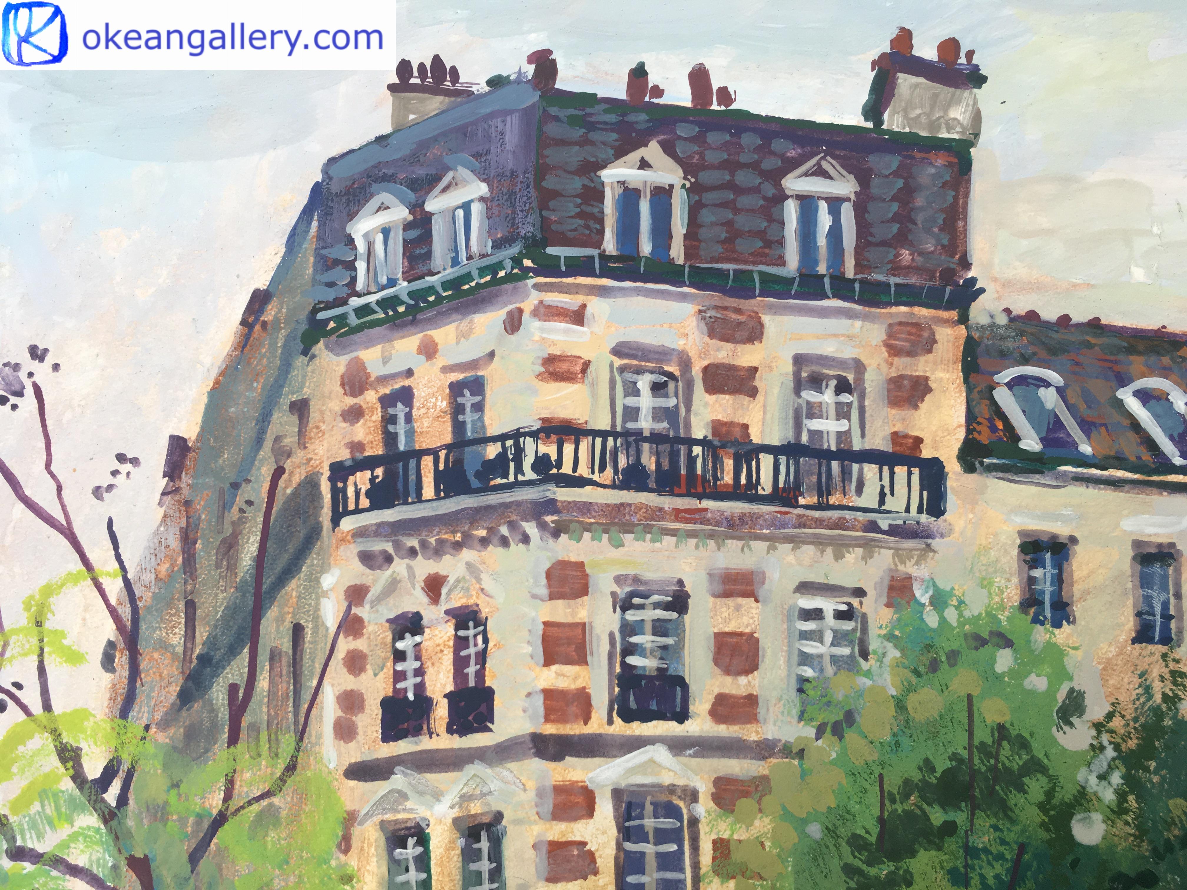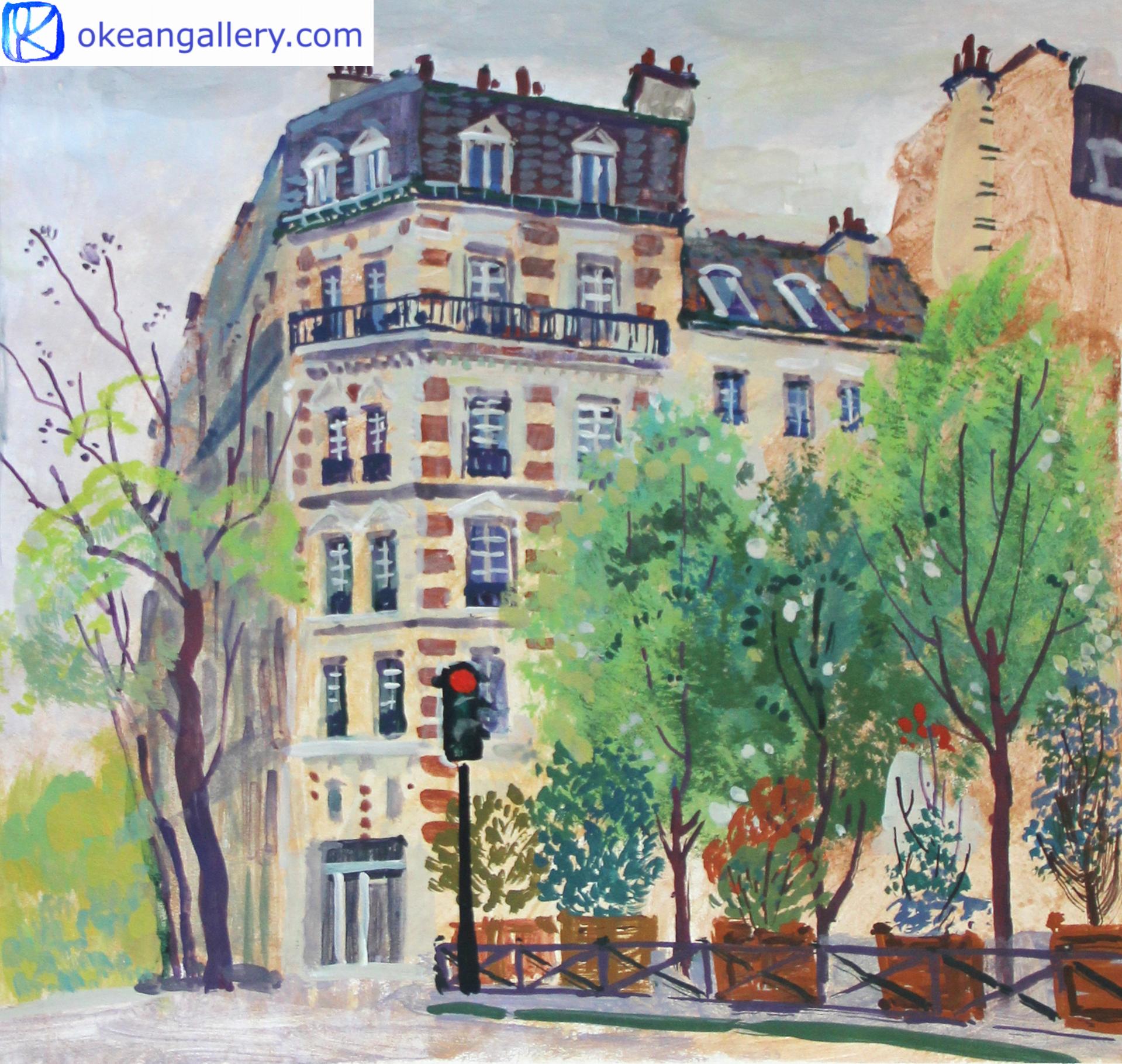 Keywords: urban landscape, architecture, France, French cityscape, travel, ochre, beige, bright colours, light blue, green, stroll in the streets, Paris, wall decor, street, lane, light, contrast, sky, trees, building, bricks, roofs, rooftops, branches, urban landscape, buildings, windows, crossroad, birthday gift, anniversary gift, Easter present, Christmas gift